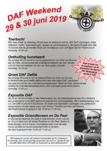 Op zondag 30 wordt er bij het geboortehuis van Hub van Doorne in America een groot defilé afgenomen met vele fraaie DAF voertuigen van jong tot oud en van origineel tot omgebouwd. Vanaf de Past. Jeukenstraat richting de Griendtsveenseweg kunt u alle voertuigen goed bewonderen.