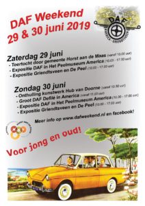 Op 29 en 30 juni worden in Het Peelmuseum aan de Griendtsveenseweg 69 in America een groot aantal oude DAF-auto’s en vrachtauto’s tentoongesteld. Dit in samenwerking met o.a. het DAF museum in Eindhoven. Er staan ook bijzondere voertuigen van particuliere verzamelaars en een kleine expo over Circus ’t Hoefke van Hub van Doorne.